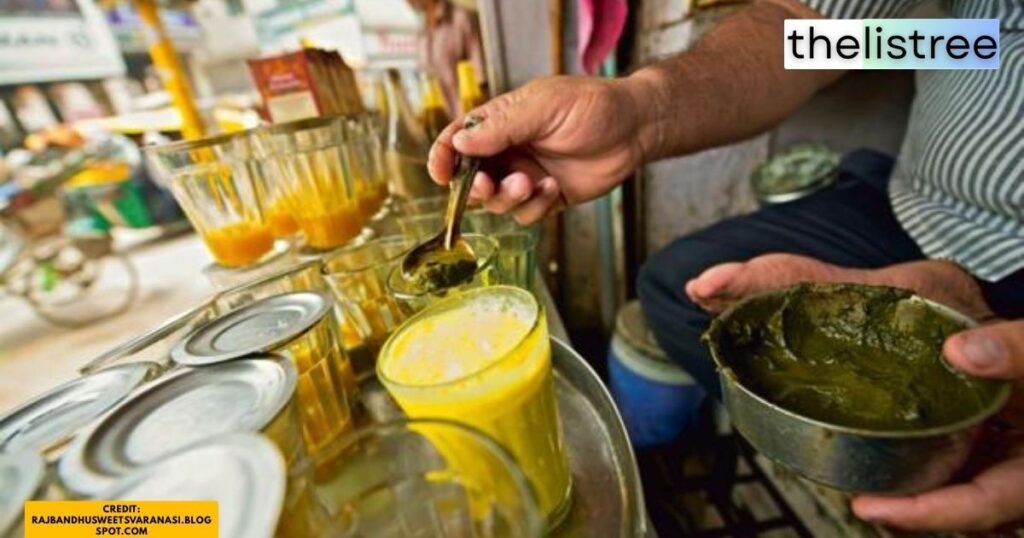 If you love cold, intensely aromatic drinks, Varanasi’s Thandai stands unmatched. Served chilled in kulhads, it gets its unique texture from an expertly ground paste of almonds, pistachios, melon seeds, fennel, rose petals, and black pepper mixed into thick, sweetened milk. (Note: During festivals like Holi or Shivratri, you can opt for the famous “Bhaang” Thandai, which is infused with the intoxicating hemp plant. It is highly prevalent around the Ghats, but strictly optional!)