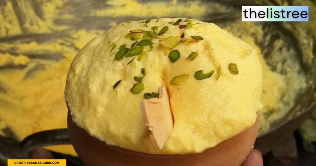 Varanasi’s thick, creamy Lassi is a deeply essential, cooling elixir specifically designed to combat the intense city heat. Unlike thinner, watery versions of buttermilk, the Banarasi Lassi is a rich, hand-whisked marvel served in an earthen pot (bhad). It is heavily loaded with fresh malai (clotted cream), sweet rabri, and crunchy dry fruits.